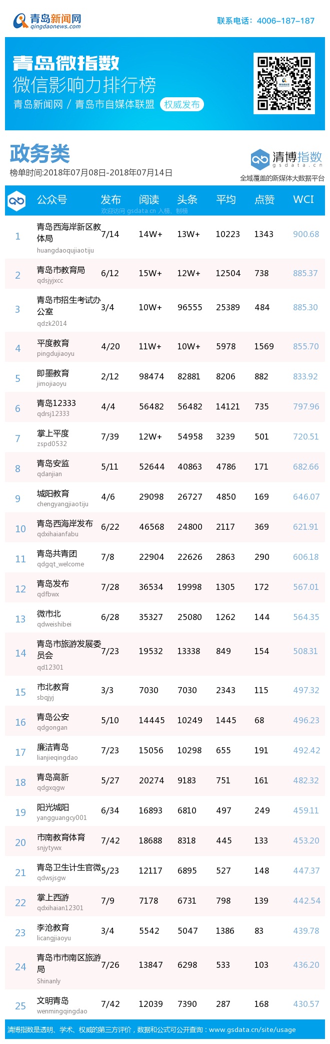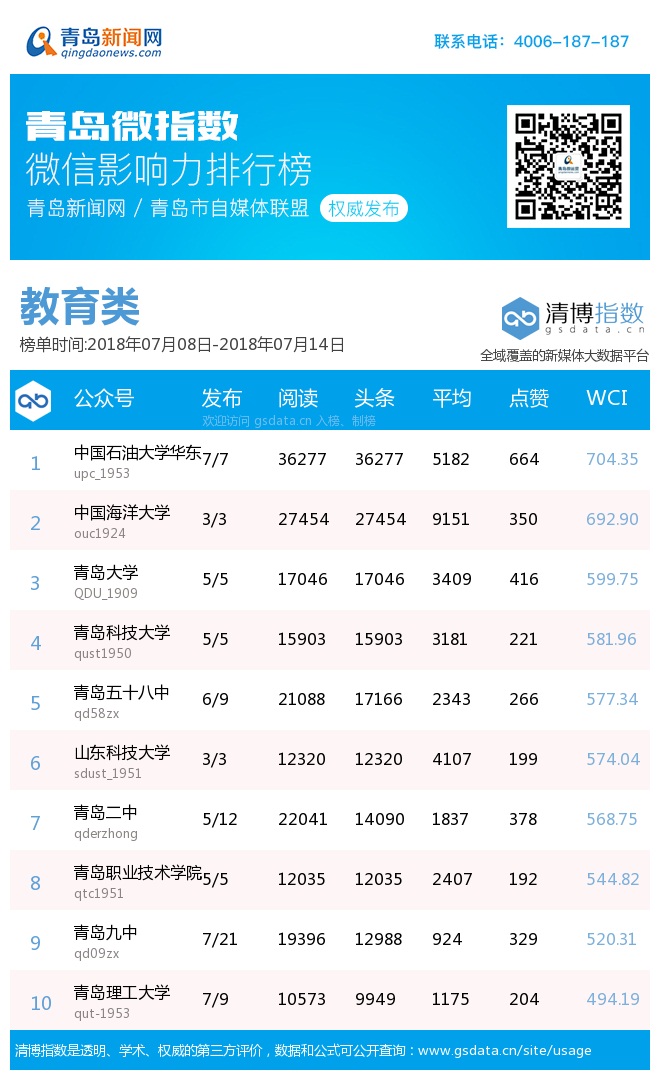 青島微指數(shù)微信影響力排行榜(7月8日-7月14日)教育類官微霸屏政務榜前五