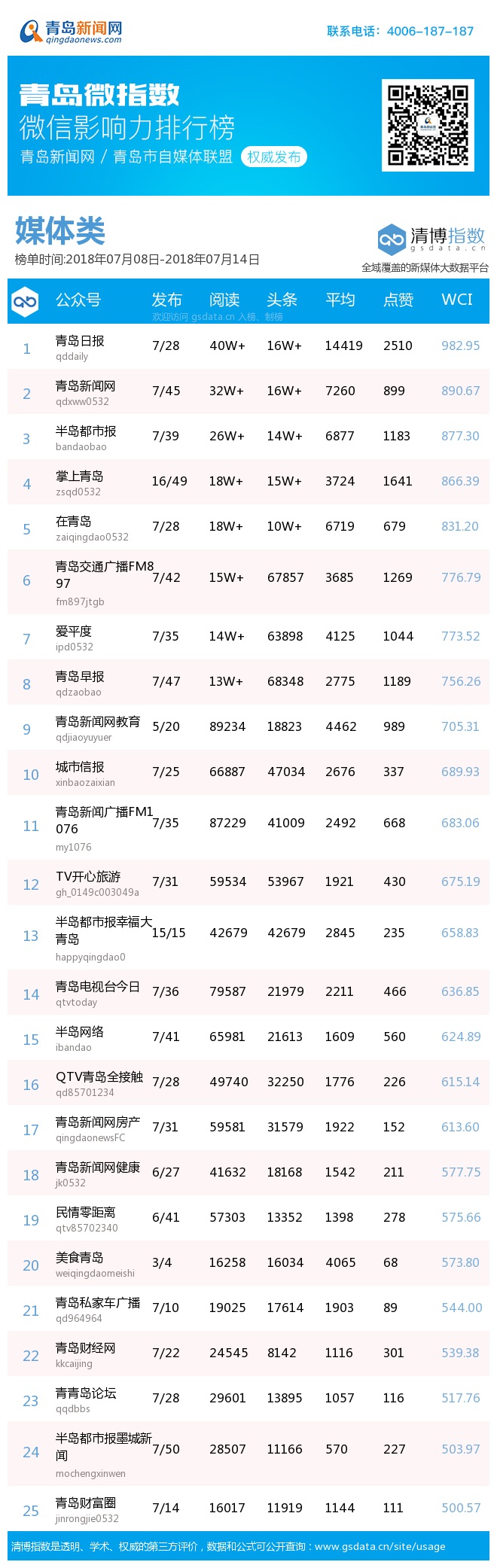 青島新聞網(wǎng)7月16日訊(記者 邢書玲)由青島新聞網(wǎng)、清博指數(shù)平臺聯(lián)手打造的“青島微指數(shù)微信影響力排行榜”今日發(fā)布一周(7.8—7.14)榜單。