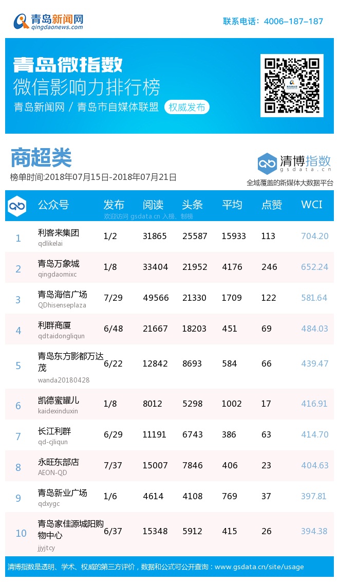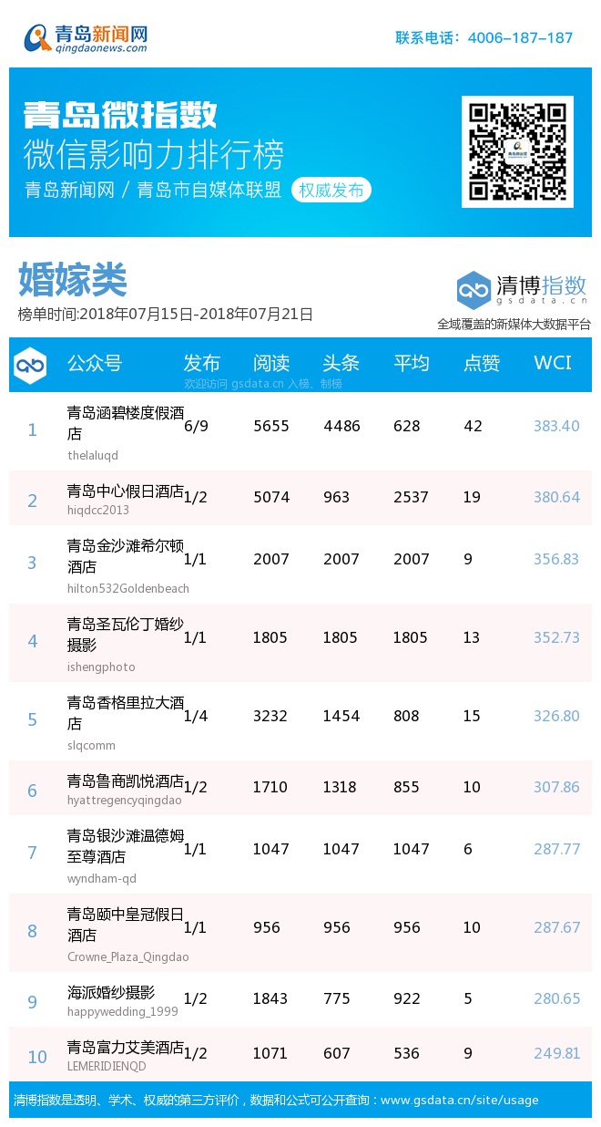 3、本次榜單收錄了青島14個行業(yè)微信公眾號,如您的賬號暫未收錄,可聯(lián)系4006-187-187。