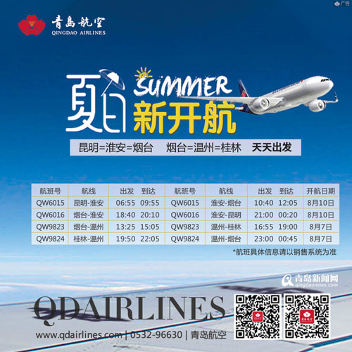 青島新聞網(wǎng)8月7日訊(記者 張力偉)暑運過半,為了讓旅客的出行更加便利,青島航空8月份計劃新增桂林、淮安兩個通航城市。隨著兩個航點的開通,青島航空在煙臺的通航城市將增至9個。目前青島航空在煙臺執(zhí)飛哈爾濱、沈陽、呼和浩特、昆明、長沙、南通、溫州航線。