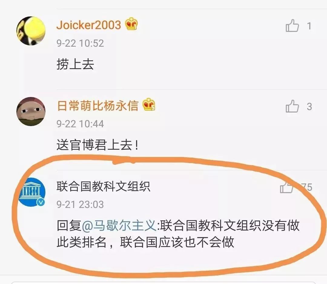 諷刺的是,“杜猛”還在微博最開始加了句“我先聲明一下,可能是聯(lián)合國教科文組織在造假?你忍心一下看完?!苯Y(jié)果聯(lián)合國教科文組織的官方微博當(dāng)天就出來“強(qiáng)力打臉”,聲明“聯(lián)合國教科文組織沒有做此類排名,聯(lián)合國應(yīng)該也不會做。”這條微博被多名網(wǎng)友舉報,微博管理方最后對其做了“不實”的標(biāo)記,對博主禁言15天,但這條假消息并未被刪,仍然掛在那里,甚是刺眼。而作者在被處理前還接著轉(zhuǎn)發(fā)了好幾條貶低中國的評論。