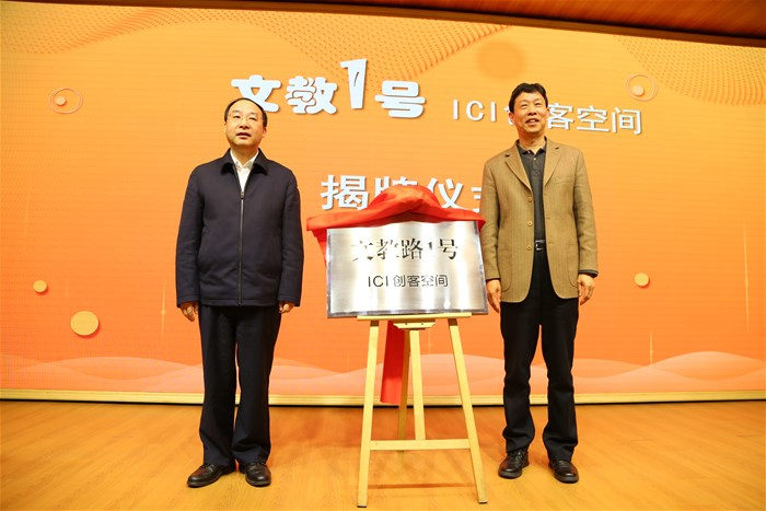 寧波市教育局副局長胡赤弟先生,寧波市互聯(lián)網(wǎng)發(fā)展聯(lián)合會(huì)副書記、副會(huì)長田勇先生為“文教1號(hào)ICI創(chuàng)客空間”揭牌