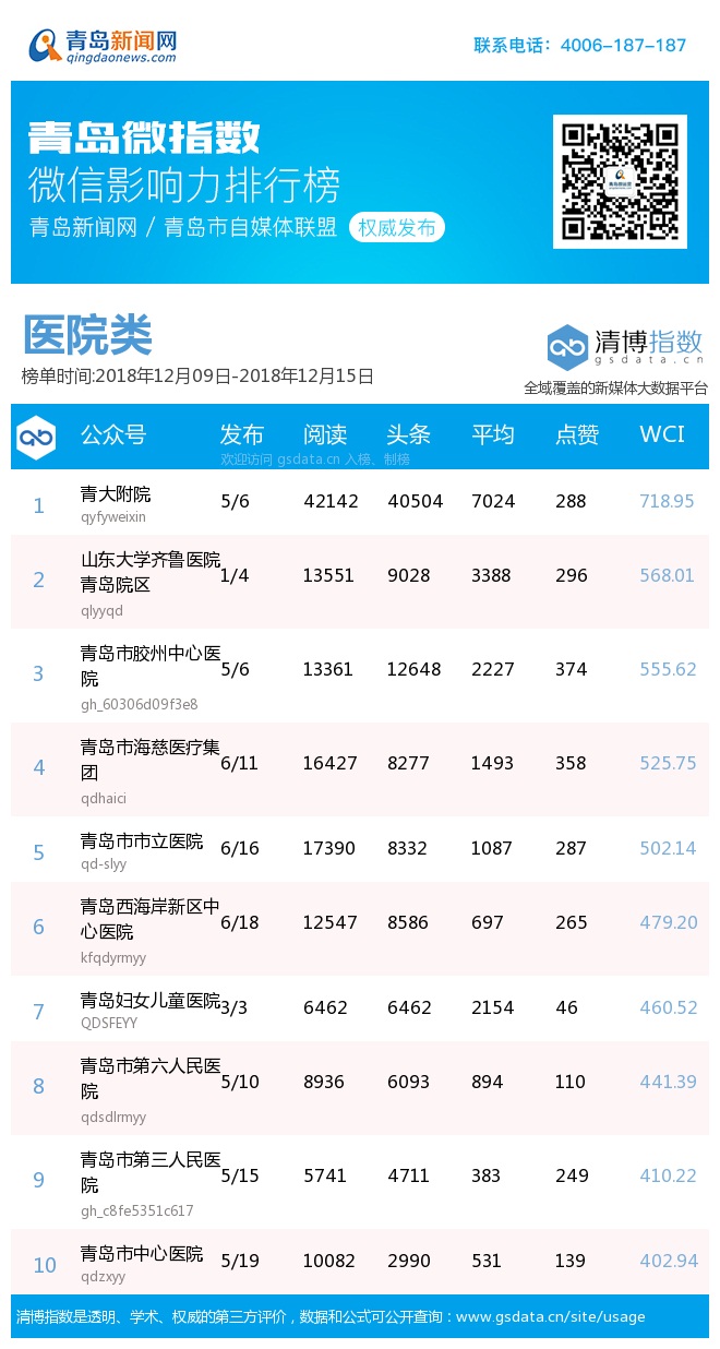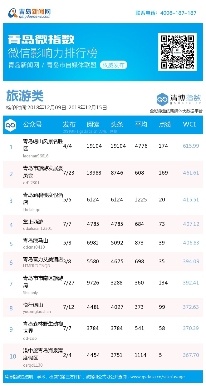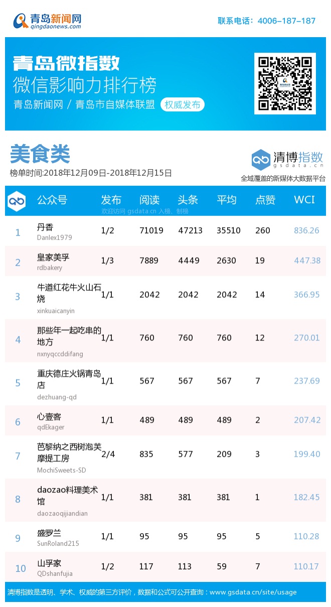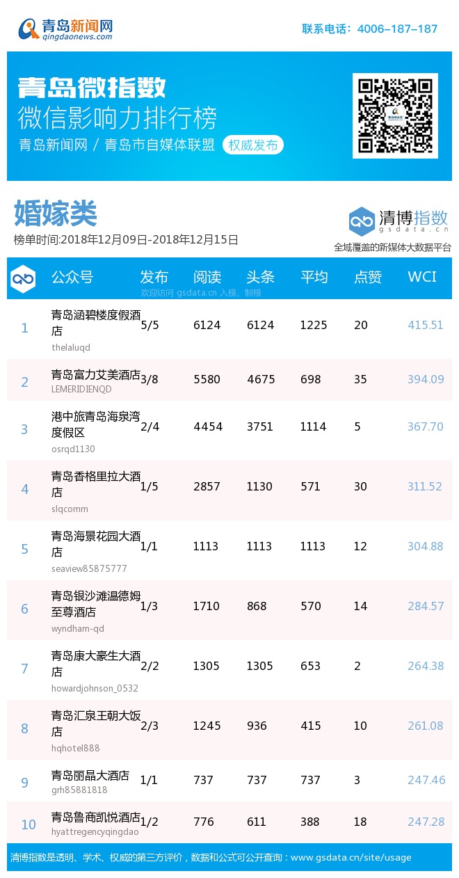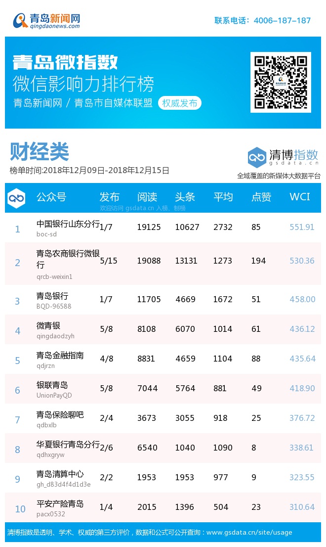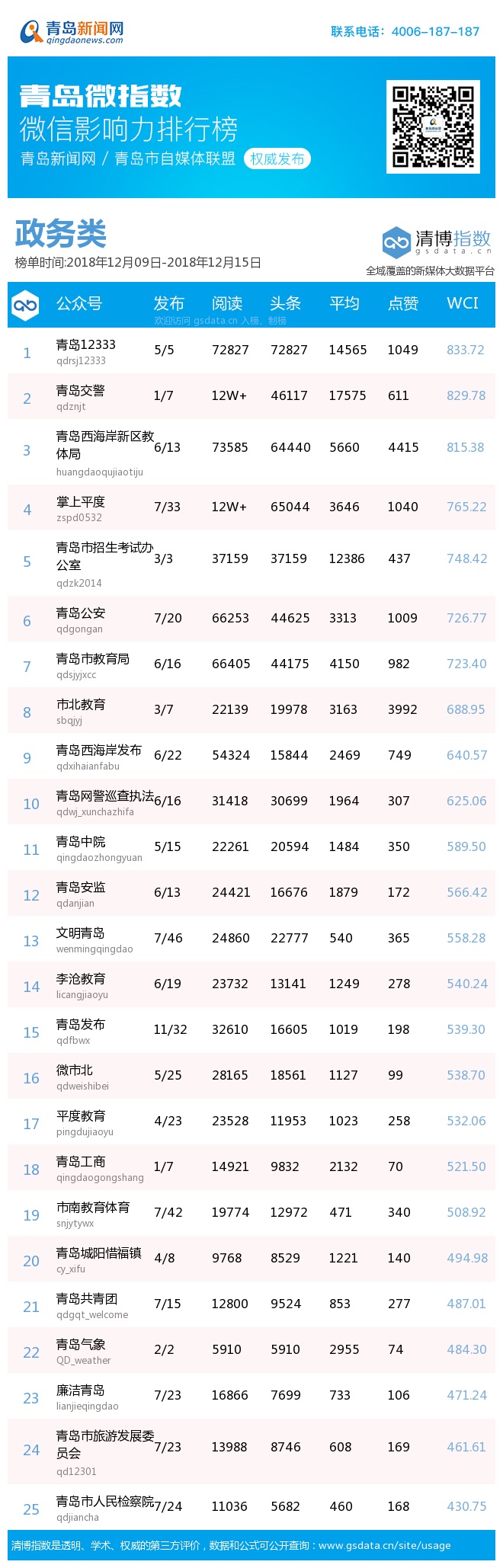 青島新聞網(wǎng)12月17日訊(記者 邢書玲)由青島新聞網(wǎng)、清博指數(shù)平臺(tái)聯(lián)手打造的“青島微指數(shù)微信影響力排行榜”今日發(fā)布一周(12月9日-12月15日)榜單。