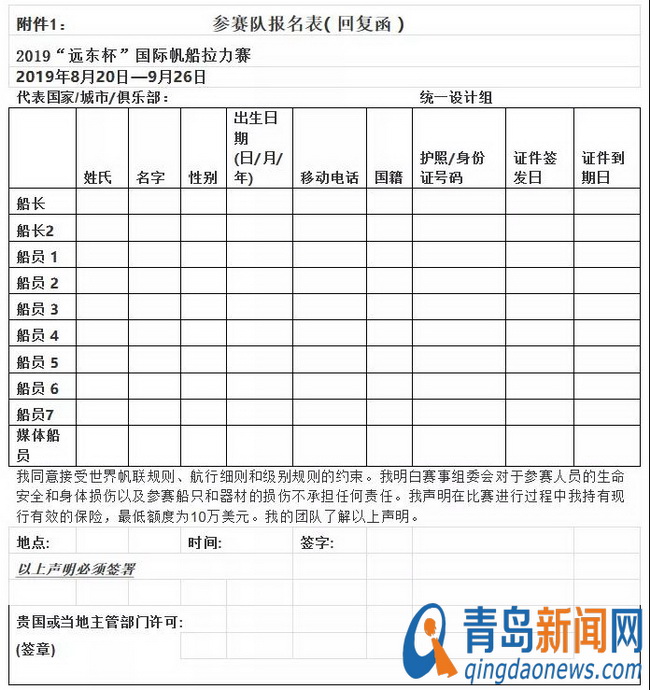 5.1.2019年6月20日24點報名截止,請在此日期之前,登陸網(wǎng)站:下載填寫報名表【附件1】并將所有船員護(hù)照或身份證掃描件與報名表一并提交至FareastCupRegatta@163.com。(外籍運(yùn)動員只需要護(hù)照復(fù)印件,中國運(yùn)動員需要護(hù)照及身份證正反面復(fù)印件)