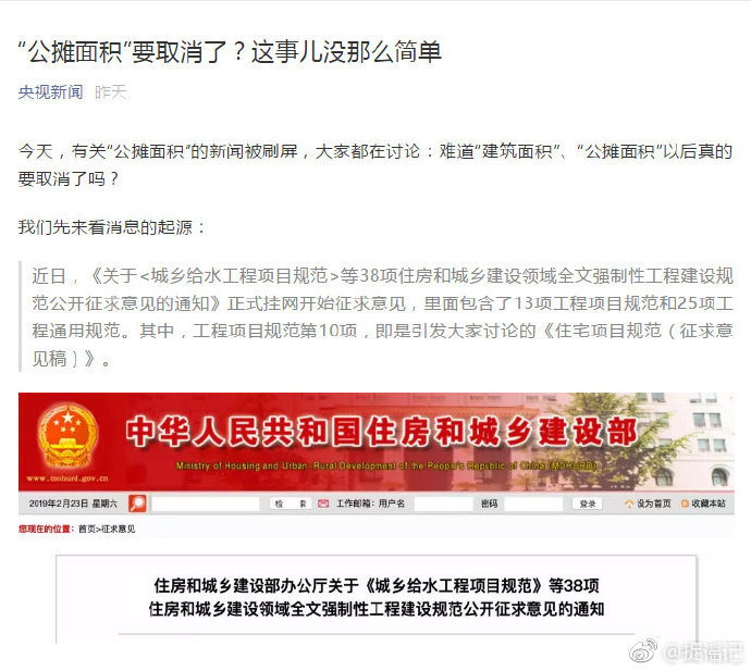 23日晚,央視在其微信公眾號上發(fā)表了一篇標(biāo)題為“‘公攤面積’要取消了?這事兒沒那么簡單”的文章。文中稱,《住宅項目規(guī)范(征求意見稿)》只是個技術(shù)規(guī)范,規(guī)范未來約束的是工程建設(shè)行為,約束對象是住宅項目的建設(shè)單位。這與我們所關(guān)心的住宅交易到底是以“建筑面積”“公攤面積”來計算,并無直接關(guān)系。與我們大家關(guān)心的物業(yè)費、取暖費以何標(biāo)準(zhǔn)收取,也沒直接關(guān)系。