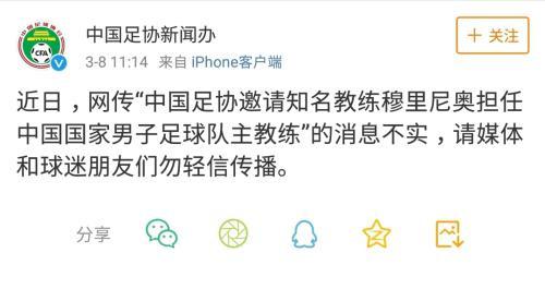針對這一傳聞,中國足協(xié)新聞辦官博辟謠稱:近日,網(wǎng)傳“中國足協(xié)邀請知名教練穆里尼奧擔(dān)任中國國家男子足球隊(duì)主教練”的消息不實(shí),請媒體和球迷朋友們勿輕信傳播。
