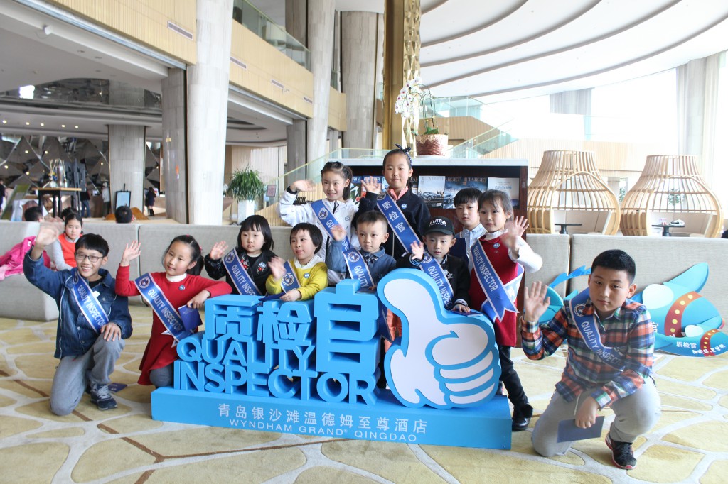 這里就是風(fēng)景秀麗、環(huán)境設(shè)施一流的青島銀沙灘溫德姆至尊酒店了!在春意盎然、清風(fēng)拂面的午后到達(dá)活動現(xiàn)場,小朋友們會先來到明亮舒適的大堂。熱情的禮賓人員早早等候在這里,帶領(lǐng)“小小質(zhì)檢官”們簽到。
