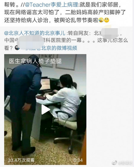 近日網(wǎng)傳一則視頻稱,在北京某眼科醫(yī)院,一位女醫(yī)生在值班坐診時,將本該是患者坐的凳子放在自己腳下,卻讓一旁的年邁患者站著看病。視頻稱,這是醫(yī)德有問題。對此,微博介紹為北京知名三甲醫(yī)院醫(yī)生的博友@Teacher李愛上病理辟謠指出,視頻中的女醫(yī)生正是他的鄰居,這位女醫(yī)生其實是一名懷了二胎的高齡產(chǎn)婦,因為腳腫的厲害,但又堅持為病人問診,所以才出現(xiàn)了視頻中的一幕。