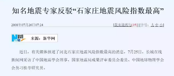 其實(shí),這是一份2004年就公布的報(bào)告,曾在數(shù)次地震之后引起各方強(qiáng)烈“圍觀”,在2008年和2013年,就已經(jīng)有專家專門進(jìn)行過辟謠。而《30個(gè)省級城市地震風(fēng)險(xiǎn)出爐石家莊最高上海最低》這份報(bào)告是一個(gè)研究生的論文,專家已經(jīng)駁斥其論點(diǎn),作者本人也已經(jīng)承認(rèn)觀點(diǎn)錯誤并道歉。