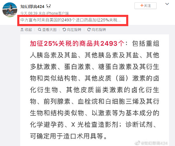 中國將對美國2493個進口藥品加征25%關稅?偷換概念!