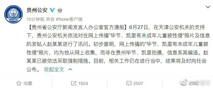 @貴州公安最新發(fā)布消息稱(chēng),6月27日,在天津公安機(jī)關(guān)的支持下,貴州公安機(jī)關(guān)依法對(duì)在網(wǎng)上傳播“畢節(jié)、凱里有未成年兒童被性侵”照片及信息的發(fā)帖人趙某某進(jìn)行了訊問(wèn)。初步查明,網(wǎng)上傳播的“畢節(jié)、凱里有未成年兒童被性侵”照片,均為他從網(wǎng)上收集,而非在貴州畢節(jié)、凱里拍攝,信息系其編造。趙某某已被依法采取強(qiáng)制措施。