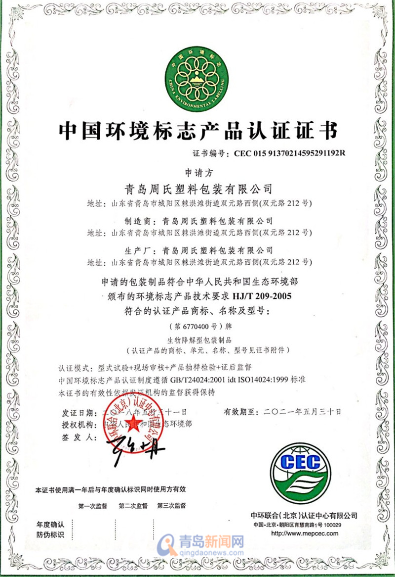 目前,青島周氏塑料包裝公司推出的“完全生物降解環(huán)保材料”購物袋,已獲得國家環(huán)境標志產品認證證書和歐洲OK compost & Seedling認證,出口歐洲、日韓,在中國與海信廣場達成合作。李雙利說告訴記者,他們正在積極與青島的各大超市進行合作洽談,爭取減少塑料袋的使用量。