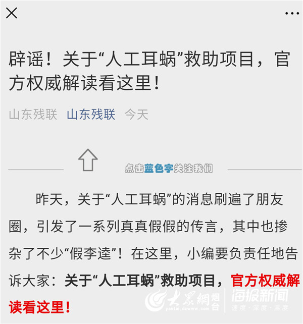 熱心網(wǎng)友本是好意,奈何消息本身“有問題”。11日上午,“山東殘聯(lián)”官方微信發(fā)布了《辟謠!關于“人工耳蝸”救助項目,官方權威解讀看這里!》的消息,明確指出,山東省以前只對0—6歲聽障兒童實施人工耳蝸救助,現(xiàn)在擴大為18周歲以下,但并不是所有聽力殘疾兒童都適合人工耳蝸植入手術,需符合相關條件才行。