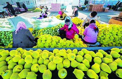 起初,小甜瓜也曾讓瓜農(nóng)們嘗到“苦”味道。隨著甜瓜種植規(guī)??焖贁U(kuò)大,交易不便、有市無(wú)場(chǎng)成了影響甜瓜外銷的大問(wèn)題。一個(gè)新的思路在馬連莊鎮(zhèn)決策者的腦海中形成:與其一家一戶到處找商販,不如建設(shè)一處大市場(chǎng),帶動(dòng)甜瓜業(yè)的良性發(fā)展,通過(guò)市場(chǎng)運(yùn)作,安排就業(yè),可以帶動(dòng)第三產(chǎn)業(yè),增加財(cái)政收入。2007年4月,在省道旁、大沽河西岸的寬闊地域,占地300畝的果蔬批發(fā)市場(chǎng)項(xiàng)目上馬,邊建邊試營(yíng)業(yè)為產(chǎn)供銷搭橋。