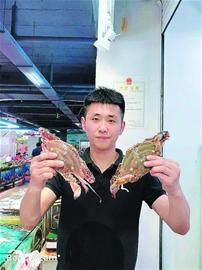 趙曰陽展示海捕蟹(左)和養(yǎng)殖蟹