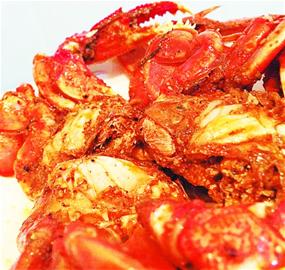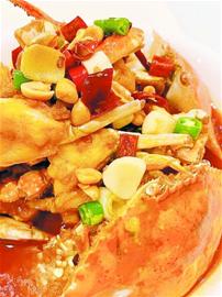 麻辣蟹:川菜風(fēng)味 中航酒店廚師長張磊在成都進(jìn)修交流,用川菜的辦法做海捕蟹,很受當(dāng)?shù)厝讼矚g。他介紹,螃蟹用刷子刷干凈,揭開蟹殼,大斬八塊。蔥姜拍散。用淀粉把蟹肉處封住。
