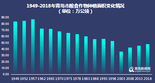 新中國成立70年來,青島糧食生產(chǎn)從種植面積上看,經(jīng)歷了一個(gè)前減后穩(wěn)的過程。