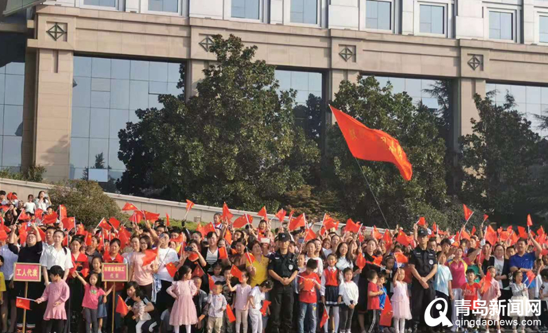 上午7時,參加升國旗儀式的人們早早來到膠州市級機關辦公大樓前廣場,他們紛紛手持國旗,翹首盼望。