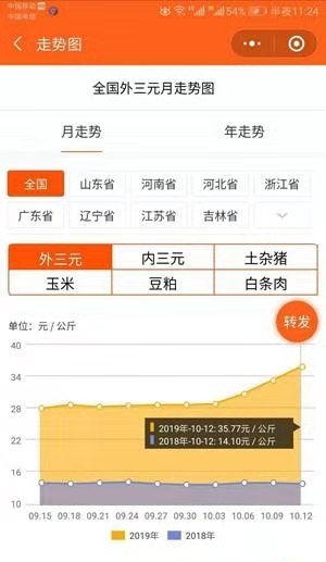 近期全國(guó)豬肉價(jià)格走勢(shì)。(數(shù)據(jù)來(lái)源:“查豬價(jià)”微信公眾號(hào))