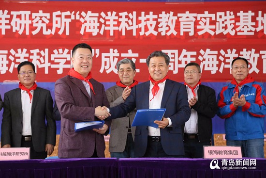 “銀海少年科學(xué)院”銀海教育集團董事長辛華龍與中科院海洋研究所黨委副書記、紀(jì)委書記畢偉簽訂合作育人協(xié)議書。