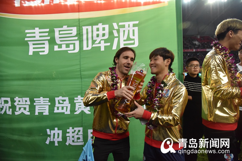 奪冠后,球員暢飲青島啤酒。