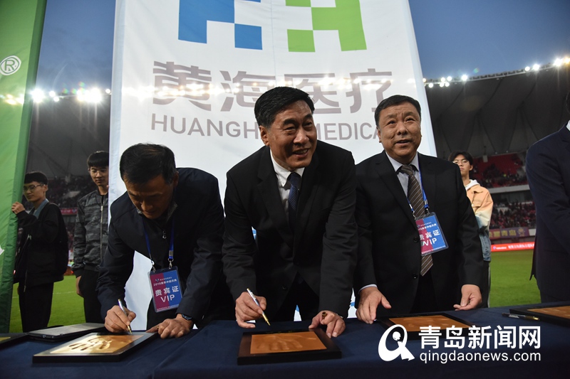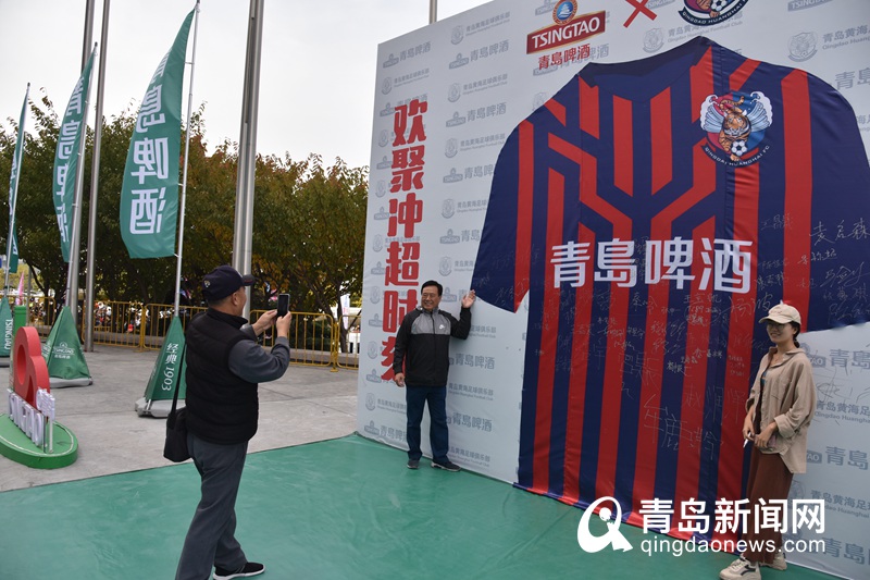 “青島啤酒”球衣前,不少球迷留下簽名,同時(shí)合影留念,記錄“沖超時(shí)刻”。
