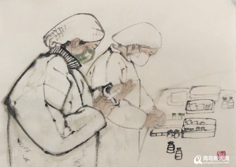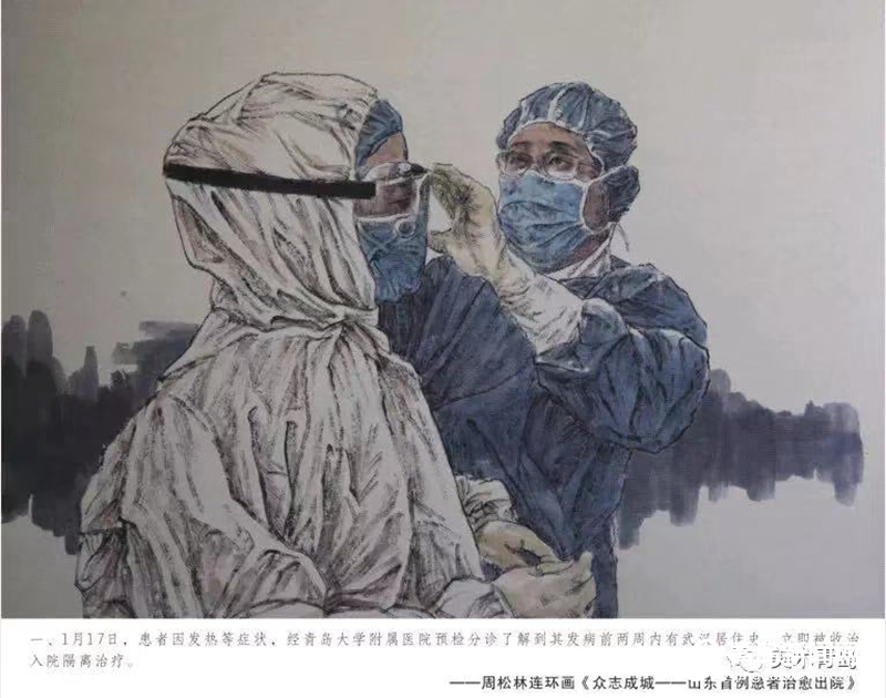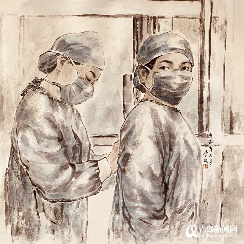 青島畫院的書畫家們用自己的畫筆描繪醫(yī)務人員奔赴一線、馳援武漢,社會各界捐款捐物、大愛無疆,人民群眾同心協(xié)力、守望相助,基層干部值班值守、排查服務等美術作品,集中呈現(xiàn)出這個特殊時期的精神圖譜。