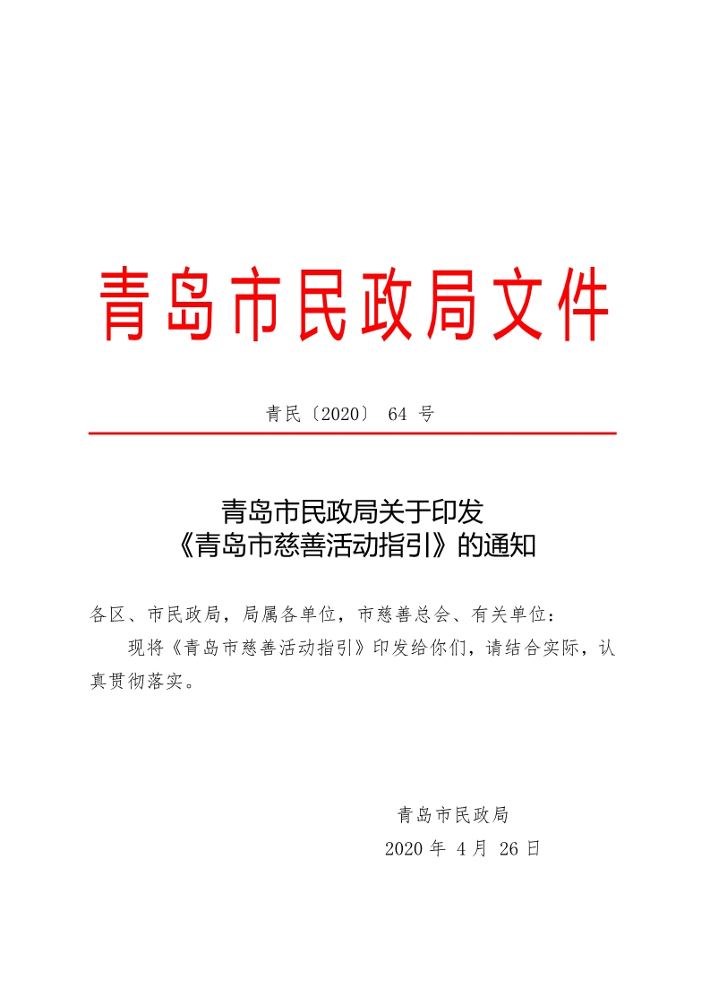 2020年4月26日,青島市民政局印發(fā)《青島市慈善活動指引》,這也是國內(nèi)首個指導慈善活動實施的標準化文件。
