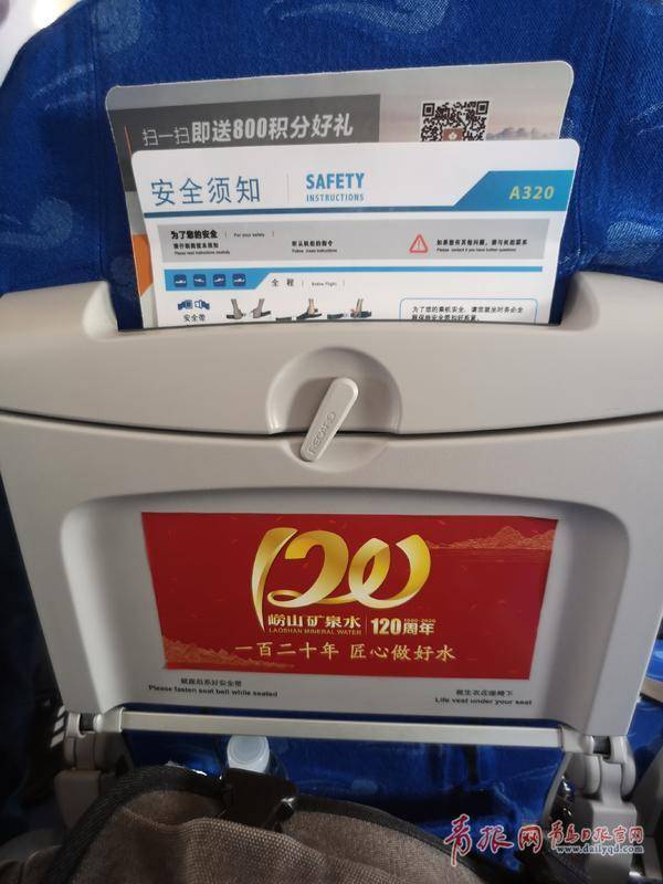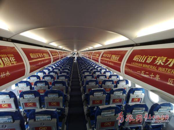 “您好,嶗山礦泉水!”剛一登機(jī),乘務(wù)員就向登機(jī)人員發(fā)放了一瓶嶗山礦泉水。走進(jìn)機(jī)艙,座位上方的近百個(gè)行李架蓋板上,大紅色的嶗山礦泉水120周年主題宣傳海報(bào),很是吸人眼球。坐在座椅上,記者留意到,機(jī)艙內(nèi)174個(gè)座椅前方的小桌板上,同樣附有“濃縮版”主題宣傳海報(bào)。值得一提的是,乘務(wù)人員還貼心為每一位顧客準(zhǔn)備了一本由青島飲料集團(tuán)出品的《水的呵護(hù)》宣傳手冊(cè)……這架飛機(jī)內(nèi),從客艙內(nèi)部裝飾、到機(jī)載視頻播放,再到機(jī)上飲用水,處處充滿嶗山礦泉水元素。