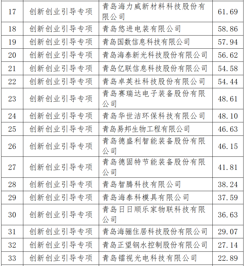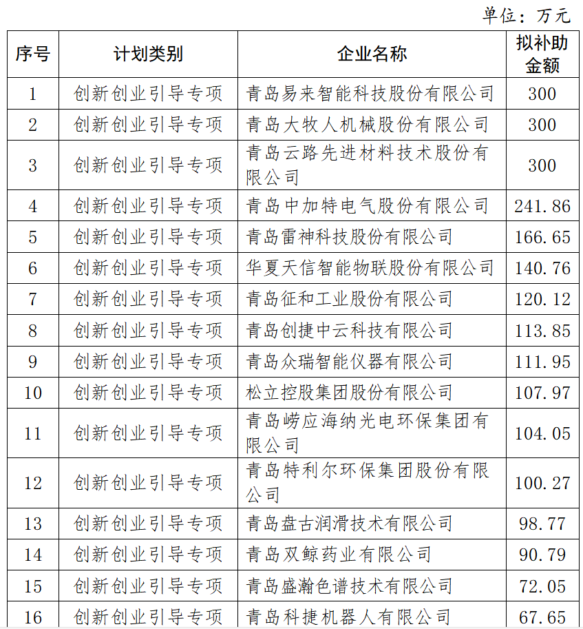 日前,青島市科技局公示了2021年青島市科技計劃創(chuàng)新創(chuàng)業(yè)引導(dǎo)專項高新技術(shù)企業(yè)上市培育庫入庫企業(yè)研發(fā)投入獎勵擬補(bǔ)助企業(yè)名單,共有36家企業(yè)有機(jī)會獲得補(bǔ)助,補(bǔ)助總額為3230.29萬元。