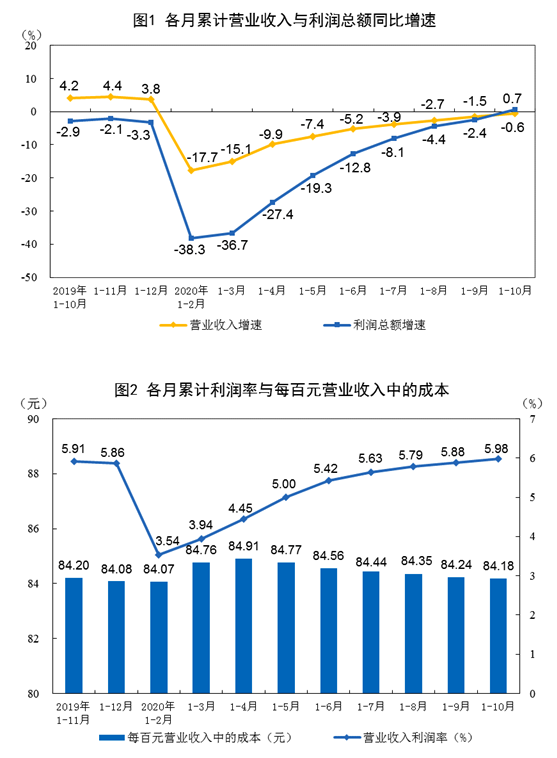1—10月份,全國(guó)規(guī)模以上工業(yè)企業(yè)實(shí)現(xiàn)利潤(rùn)總額50124.2億元,同比增長(zhǎng)0.7%(按可比口徑計(jì)算,詳見(jiàn)附注二),1—9月份為下降2.4%。