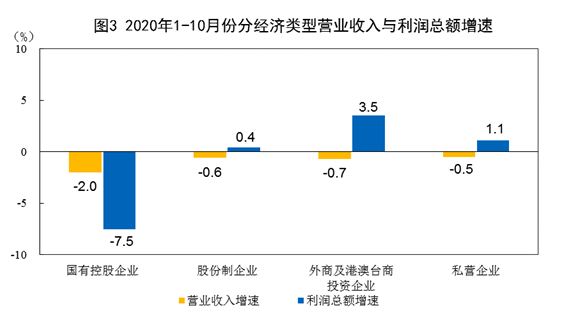 1—10月份,規(guī)模以上工業(yè)企業(yè)中,國(guó)有控股企業(yè)實(shí)現(xiàn)利潤(rùn)總額12942.6億元,同比下降7.5%;股份制企業(yè)實(shí)現(xiàn)利潤(rùn)總額35417.4億元,增長(zhǎng)0.4%;外商及港澳臺(tái)商投資企業(yè)實(shí)現(xiàn)利潤(rùn)總額14095.5億元,增長(zhǎng)3.5%;私營(yíng)企業(yè)實(shí)現(xiàn)利潤(rùn)總額14830.8億元,增長(zhǎng)1.1%。
