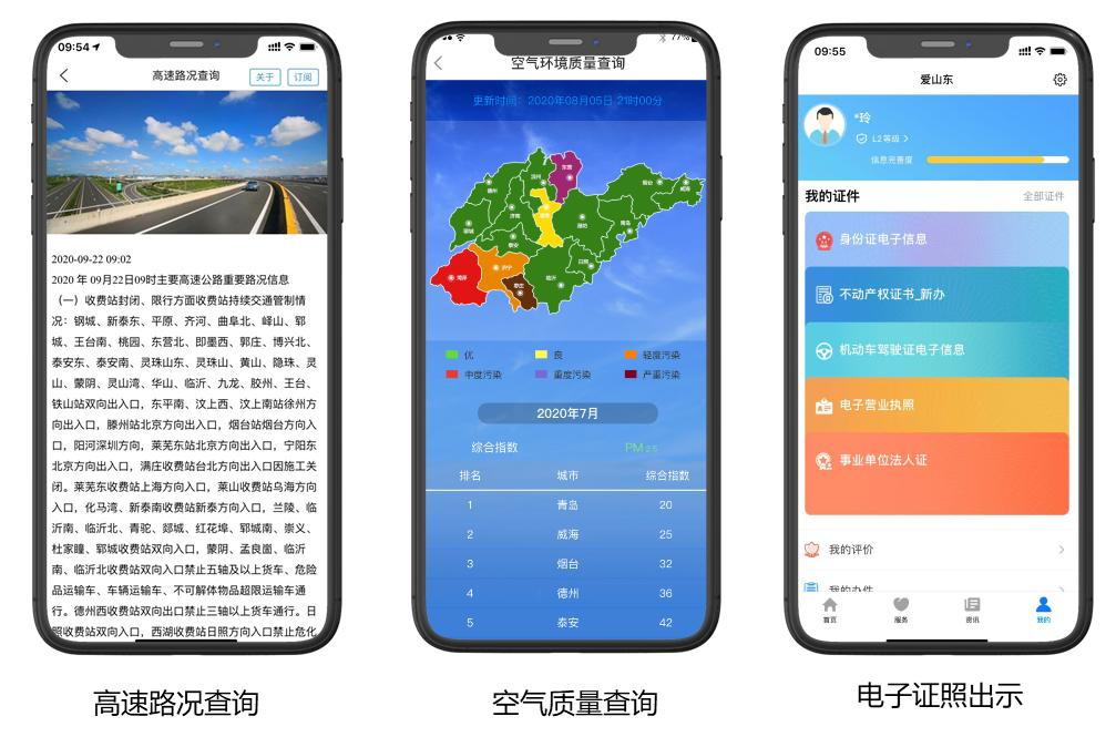此外,在山東打開“愛山東”APP,還能查詢高速路況、環(huán)境氣象、駕駛員記分等出行服務(wù)。同時,將電子身份證、駕駛證、行駛證等常用電子證照提前領(lǐng)取放入“卡包”中,出行在外,證件遺失忘帶也能輕松應(yīng)對,真正實(shí)現(xiàn)“一部手機(jī)走齊魯”。