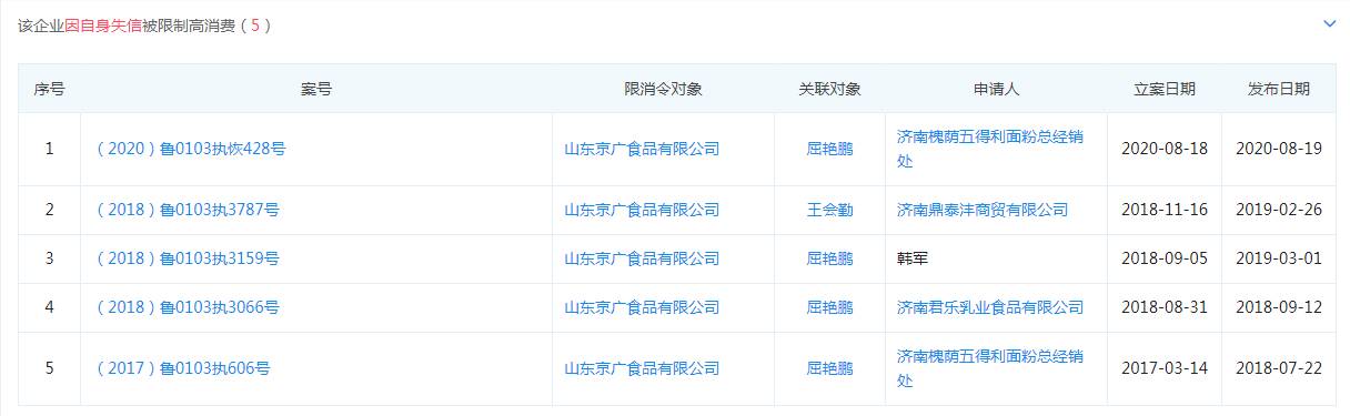 欠貨款20萬(wàn) “山東京廣食品”被限制高消費(fèi)已達(dá)5次 曾因京八件糕點(diǎn)被罰