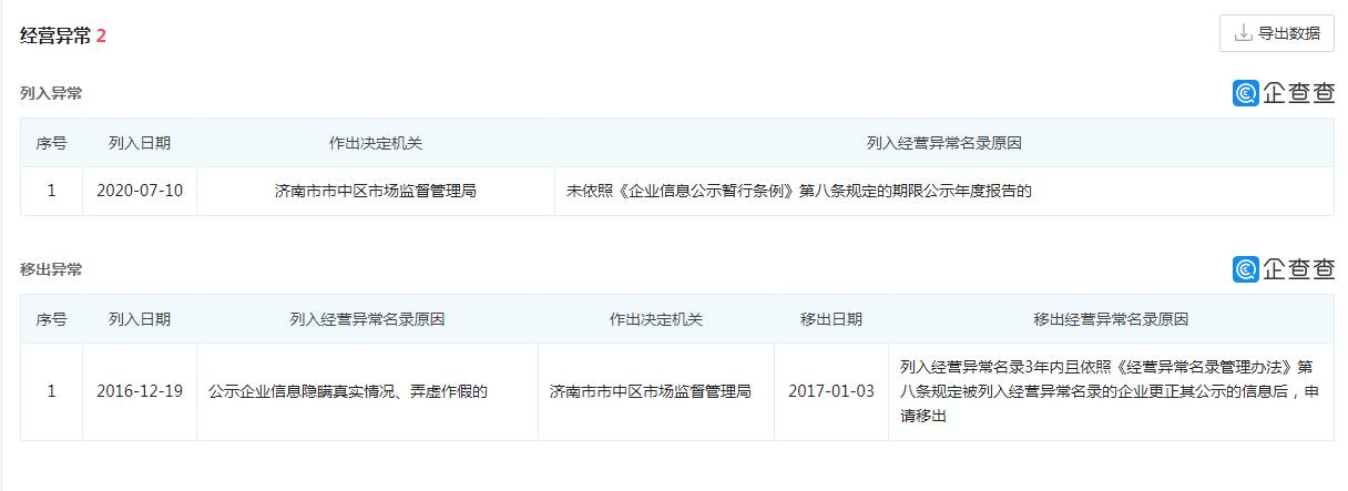 2016年12月19日,山東京廣食品有限公司因隱瞞真實(shí)情況、弄虛作假被濟(jì)南市市中區(qū)市場(chǎng)監(jiān)督管理局列入經(jīng)營(yíng)異常名錄,2017年1月3日被移出后,僅過(guò)了3年,2020年7月10日,因未依照《企業(yè)信息公示暫行條例》第八條規(guī)定的期限公示年度報(bào)告,濟(jì)南市市中區(qū)市場(chǎng)監(jiān)督管理局再次將其列入經(jīng)營(yíng)異常名錄至今。