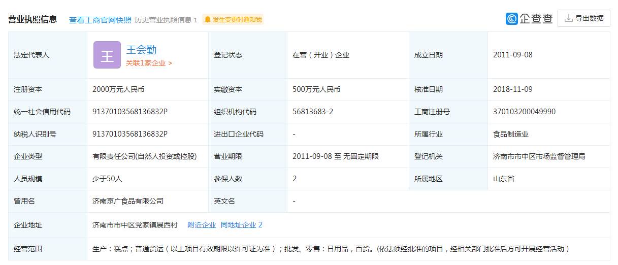 記者通過(guò)企查查查詢(xún)發(fā)現(xiàn),山東京廣食品有限公司成立于2011年9月8日,注冊(cè)資本2000萬(wàn)元人民幣,主要經(jīng)營(yíng)生產(chǎn)糕點(diǎn),普通貨運(yùn),批發(fā)、零售日用品、百貨,公司法人經(jīng)歷過(guò)2次變更。山東京廣食品有限公司曾因自身失信被先后5次限制高消費(fèi)。