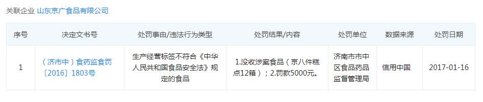 而在2017年1月16日,山東京廣食品有限公司因生產(chǎn)經(jīng)營(yíng)標(biāo)簽不符合規(guī)定被作出沒(méi)收涉案食品(京八件糕點(diǎn)12箱)、罰款5000元的處罰。