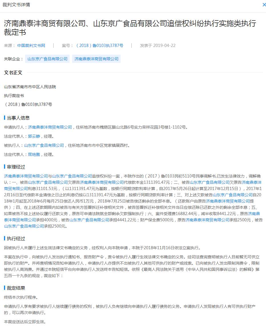 從2016年6月至今,山東京廣食品有限公司被執(zhí)行總金額高達(dá)3542201元,其中最高的一次是1342493元。這次,山東京廣食品有限公司同樣因?yàn)榍窛?jì)南鼎泰灃商貿(mào)有限公司的債務(wù)無(wú)法償還而被法院限制高消費(fèi)。