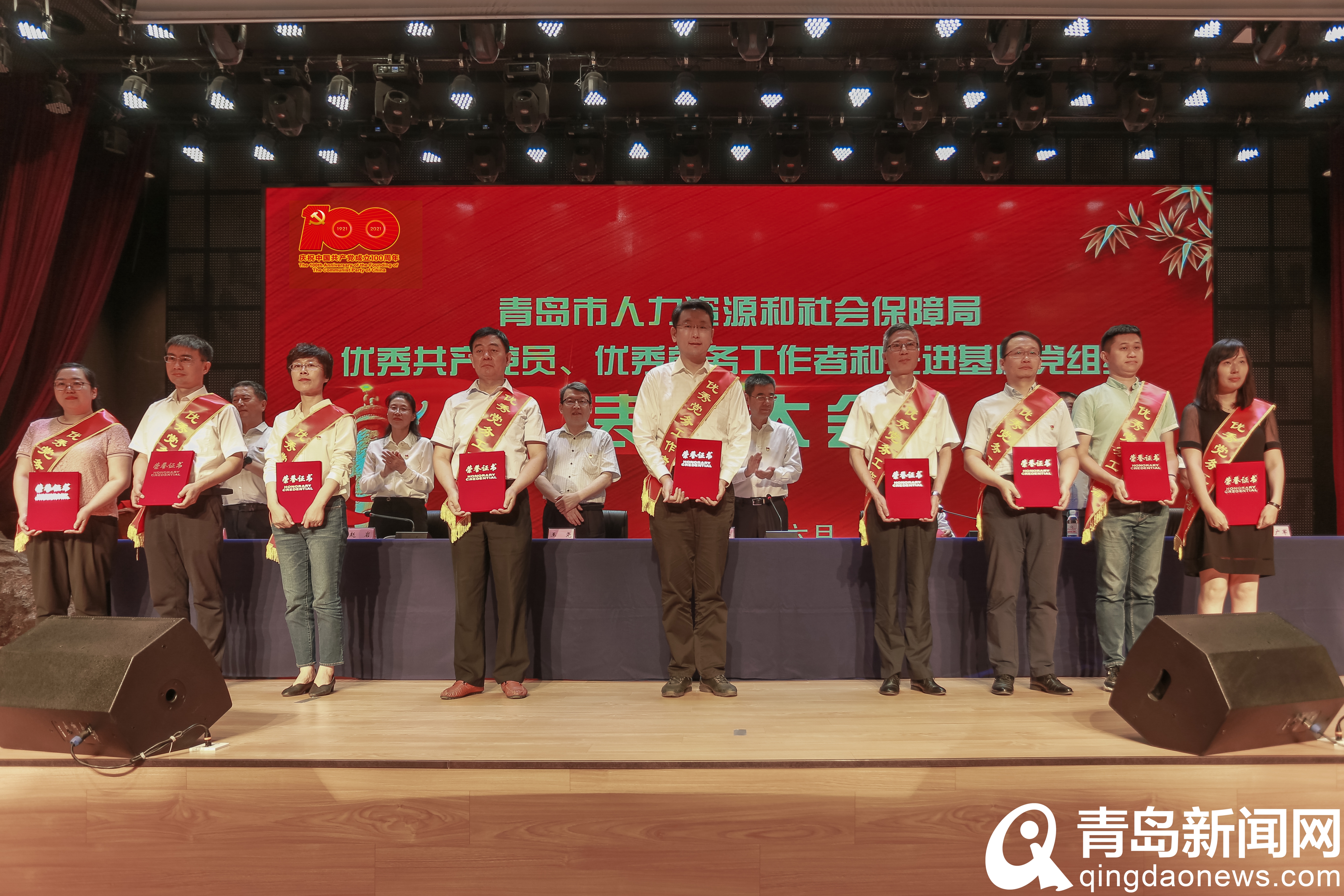 與會(huì)領(lǐng)導(dǎo)為受到表彰的優(yōu)秀共產(chǎn)黨員、優(yōu)秀黨務(wù)工作者和先進(jìn)基層黨組織頒發(fā)榮譽(yù)證書和獎(jiǎng)牌;青島市委組織部副部長,市人社局黨組書記、局長胡義瑛同志作了講話,他強(qiáng)調(diào),要在緬懷黨的豐功偉業(yè)中,始終堅(jiān)守忠誠之心,續(xù)寫愛黨建黨新篇章;在謳歌黨的豐功偉業(yè)中,始終堅(jiān)守為民之心,續(xù)寫服務(wù)民生新篇章;在禮贊黨的豐功偉業(yè)中,始終堅(jiān)守奮斗之心,續(xù)寫擔(dān)當(dāng)作為新篇章;在追溯黨的豐功偉業(yè)中,始終堅(jiān)守敬畏之心,續(xù)寫清正廉潔新篇章。