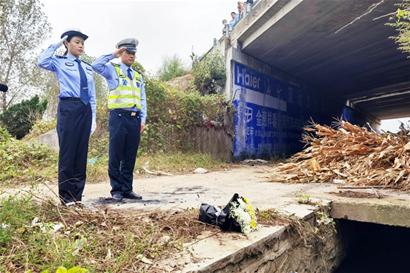 5日,早報記者趕到事發(fā)地點,橋下的水渠旁還殘存著一些血跡,李涌就犧牲在這里。李涌同事和其他趕來緬懷李涌的人,已經在此處放上鮮花和礦泉水。這是一處高速公路下穿的鄉(xiāng)村公路涵洞,從地面到高速公路護欄有近4米的高度,下面是水泥硬化的路面,旁邊是一處半米寬的水渠。李涌跌落的地方就在水渠和路邊之間。