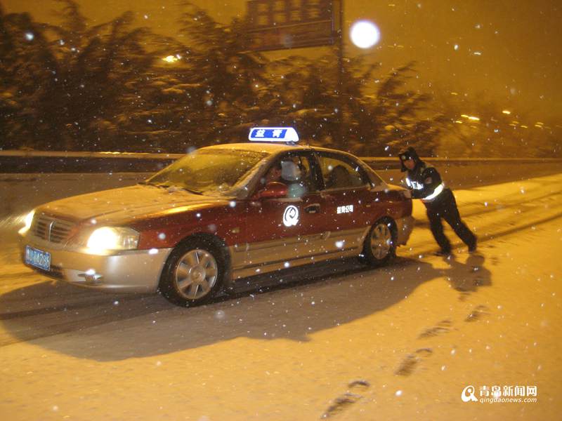 每年下大雪時(shí),李涌都會出現(xiàn)在膠寧高架路的上坡路段,發(fā)動駕駛員相互推車自救。有時(shí),他甚至把自己的身軀趴車頭上,用增加車前部重量的方法,避免輪胎打滑,一輛一輛地,引導(dǎo)近百輛車順利通過。