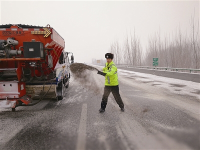 下雪天,李涌在高速路上協(xié)助路政部門撒融雪劑。
