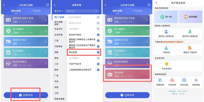 手機下載“愛山東”APP,登陸后點擊“我的證照”,打開后點擊“證照申領(lǐng)”,增加“營業(yè)執(zhí)照”模塊,即可以打開電子營業(yè)執(zhí)照小程序。