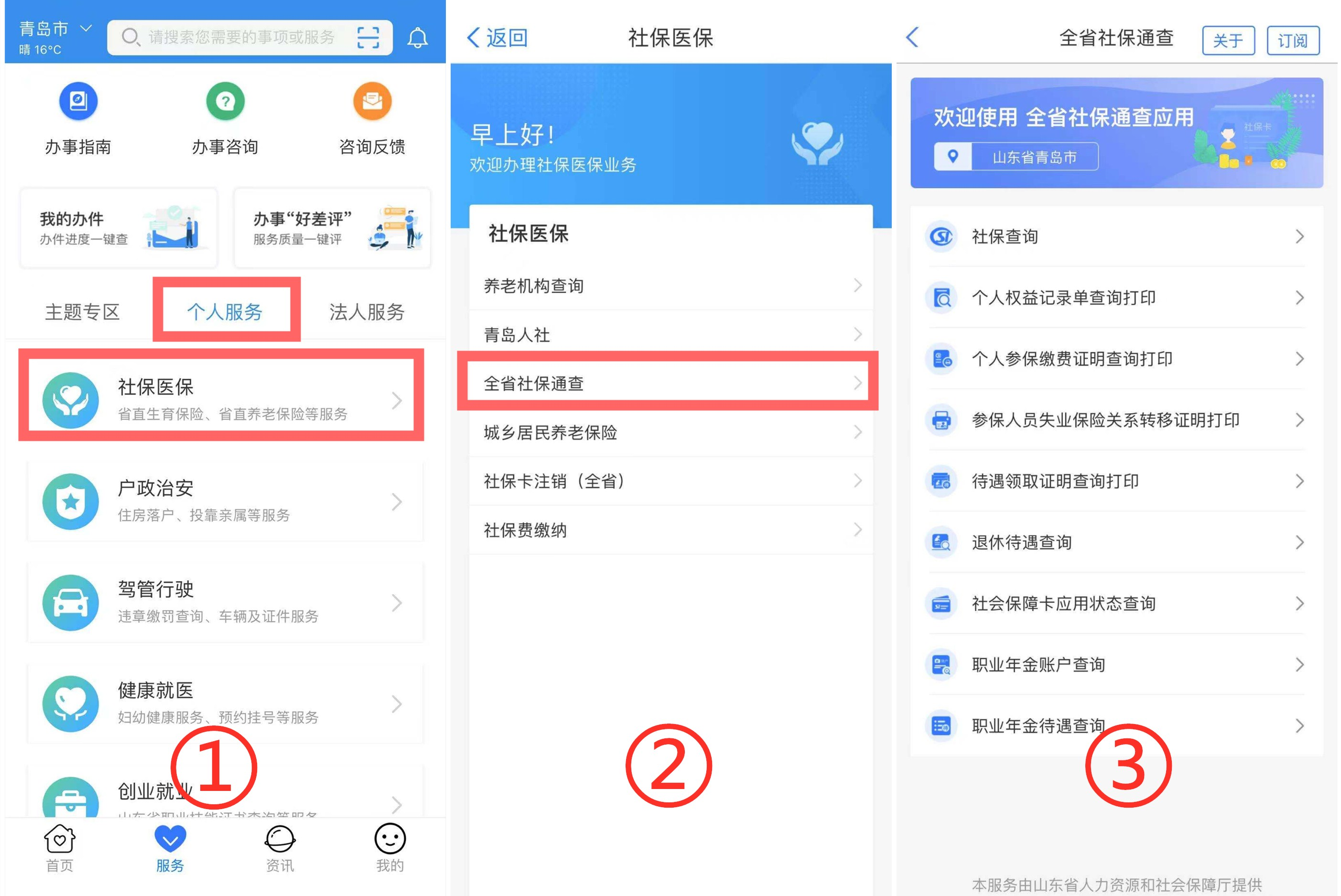 ①山東省內(nèi)參保人員打開“愛山東”APP,注冊(cè)登錄后在首頁左上角選擇進(jìn)入“青島站”,依次點(diǎn)擊【服務(wù)】—【個(gè)人服務(wù)】—【社保醫(yī)保】,選擇進(jìn)入【全省社保通查】服務(wù)。