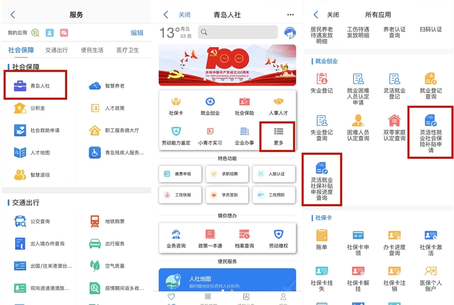 滿足條件的靈活就業(yè)人員只需在“愛山東·青e辦”首頁服務詳情頁的“社會保障”分類下,找到“青島人社”服務點擊進入,在“就業(yè)創(chuàng)業(yè)”模塊下找到“靈活性就業(yè)社會保險補貼申請”點擊進入詳情頁,填寫信息并上傳所需材料,即可進行申報。申報成功后,還可通過“靈活就業(yè)社保補貼申報進度查詢”服務,查詢辦理進度。
