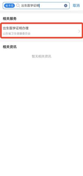1.打開(kāi)“愛(ài)山東”APP,首頁(yè)搜索“出生醫(yī)學(xué)證明”,點(diǎn)擊進(jìn)入(詳見(jiàn)圖1)。