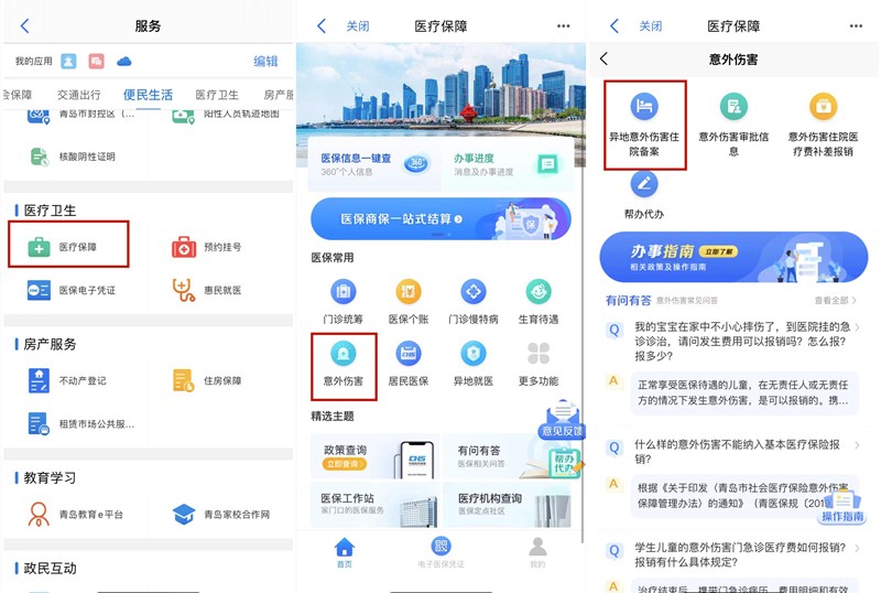 完成異地就醫(yī)備案是參保人在外地因意外臨時就醫(yī)要做的必備步驟。參保人可通過“愛山東·青e辦”APP內(nèi)的醫(yī)療保障服務(wù)辦理。參保人下載注冊“愛山東·青e辦”APP后,只需兩步即可掌上完成異地就醫(yī)備案。首先,在“愛山東·青e辦”APP首頁頂端搜索欄搜索“醫(yī)療保障”應(yīng)用或在首頁依次點擊更多-醫(yī)療衛(wèi)生-醫(yī)療保障;然后,在醫(yī)保常用的“意外傷害”分類下,找到“異地意外傷害住院備案”,根據(jù)提示填寫相應(yīng)信息后,即可辦理相應(yīng)備案手續(xù)。
