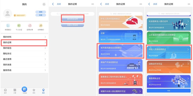 城鄉(xiāng)居民最低生活保障證、特困人員救助證等困難群體需要的電子證照只需要操作三步,即可申領(lǐng)。首先,打開(kāi)“愛(ài)山東·青e辦”APP,登錄后,點(diǎn)開(kāi)右下角“我的”,進(jìn)入詳情頁(yè)后點(diǎn)擊“我的證照”。第二步,刷臉認(rèn)證后,進(jìn)入證照添加頁(yè)面,點(diǎn)擊“查詢(xún)添加證照”,搜索要申領(lǐng)的證照關(guān)鍵詞,點(diǎn)擊該證照。第三步,進(jìn)入證照領(lǐng)取頁(yè)面后,點(diǎn)擊下方的添加到我的證照按鈕即為領(lǐng)取成功。