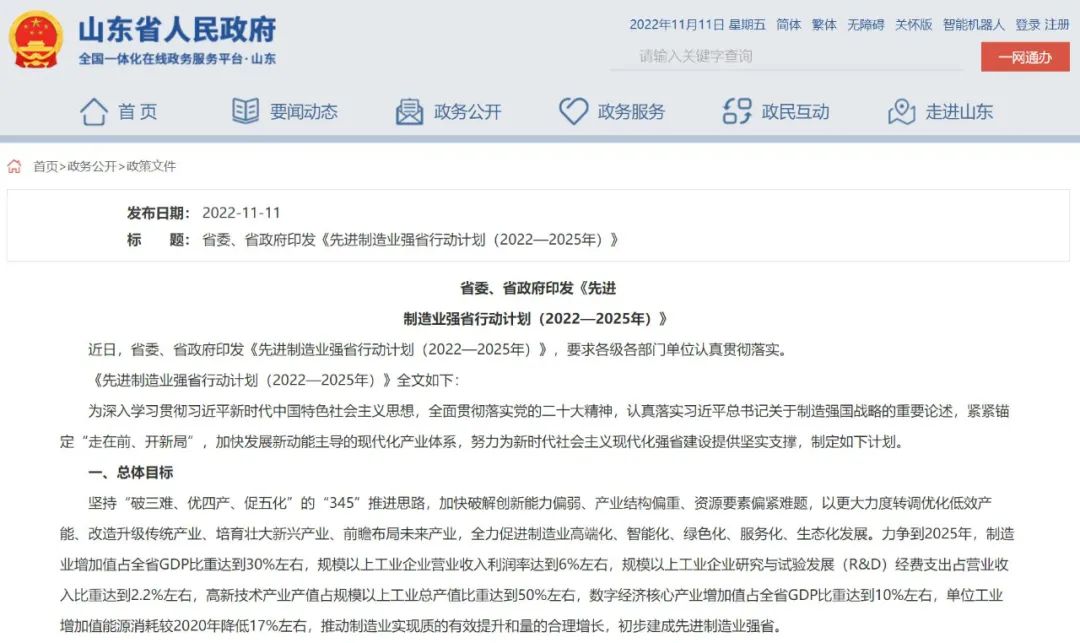 近日,山東省委、省政府印發(fā)《先進(jìn)制造業(yè)強(qiáng)省行動計(jì)劃(2022—2025年)》(下稱《行動計(jì)劃》),力爭到2025年,制造業(yè)增加值占全省GDP比重達(dá)到30%左右,推動制造業(yè)實(shí)現(xiàn)質(zhì)的有效提升和量的合理增長,初步建成先進(jìn)制造業(yè)強(qiáng)省。