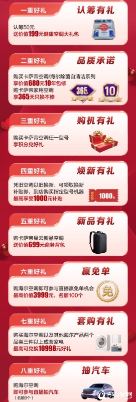 據(jù)悉,海爾&金鼎廣場海爾健康空調(diào)節(jié)活動時間從3月5日到4月5日,活動期間可享認籌送好禮、品質(zhì)承諾、購機有禮、換新有禮等多重鉅惠。認籌50元送價值199元健康空調(diào)大禮包;購買卡薩帝空調(diào)/海爾除菌自清潔系列享價值680元10年包修;購卡薩帝家用空調(diào)享365天只換不修;購海爾空調(diào)即可參與直播贏免單機會,最高價值3999元,名額100個……感興趣的小伙伴可到金鼎廣場6樓的家電商場了解,“女神節(jié)”來臨,還不快給家里的她換上新家電?這次家電節(jié)千萬別錯過!